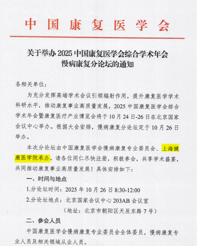 2025年10月24-26日,以“生态聚合,智慧驱动,引领全生命周期康复新范式”为主题的2025中国康复医学会综合学术年会在北京国家会议中心隆重举行。本次盛会汇聚了全国康复医学领域的顶尖专家、学者、从业者及产业代表,共襄学术盛宴,共绘康复蓝图。在这场高规格的学术盛会中,由上海健康医学院成功承办的“慢病康复分论坛”备受瞩目,充分展现了我校在慢病康复领域的学术影响力与积极贡献。