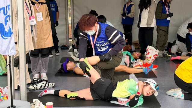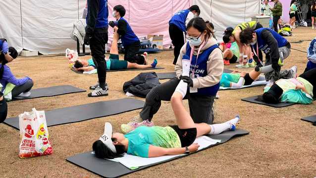 当天凌晨7时许,由32名上海健康医学院学生志愿者携手外校志愿者及专业康复人员组成的服务团队,已在中山公园终点拉伸区准备就绪。他们提前完成设备调试与分区布点,以饱满热情迎接完赛跑者。服务过程中,学生们在放松区、静态拉伸区、损伤咨询区等岗位有序协作,针对跑者腿部、肩部等易疲劳部位提供精准拉伸,累计服务超2000人次,赢得广泛好评。