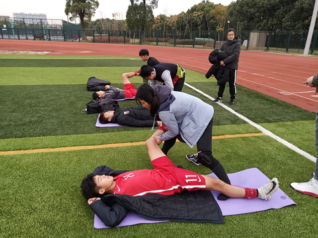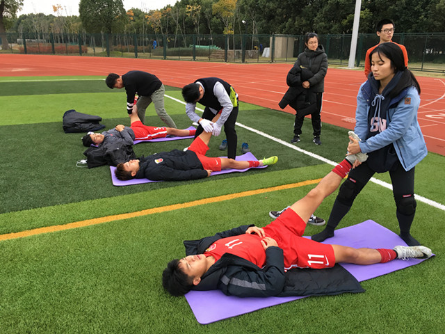 12月19日,上港U17足球队与华东师范大学校队在华师大闵行校区进行了一场激烈的训练赛。康复学院“悦康牵伸志愿服务队”成员随同学校体育教学部“运动与健康志愿服务队”成员一起为上港U17足球青训队进行赛后牵伸服务。