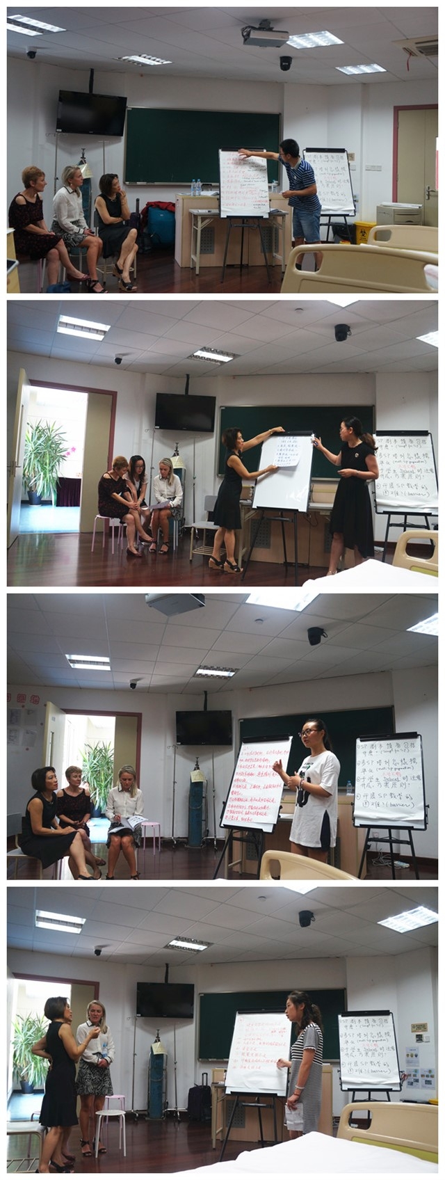 本次培训班主要采用了外籍专家讲解,学员分小组进行学习的模式进行,以学习规范的SP教学法和基本技能。其间多种教学方法贯穿其中——小组讨论、角色扮演、汇报展示等,得到各位学员的积极配合,提高了学习兴趣和效率,炎炎夏日阻挡不了学员们学习的热情,积极开展与专家的互动,有疑问及时与专家进行沟通,共同探讨最优方案。在最后一天的学习成果展示中,四个小组的优秀表现得到了三位授课专家的高度评价。对于各位学员今后在各自单位、部门进行标准化病人教学方法的开展,三位专家也分享了她们的经验,鼓励各位学员克服困难,勇于开始小范围的尝试,彼此加强交流、分享经验,逐渐将这种教学方法推广使用,以提高康复治疗人才的培养质量。