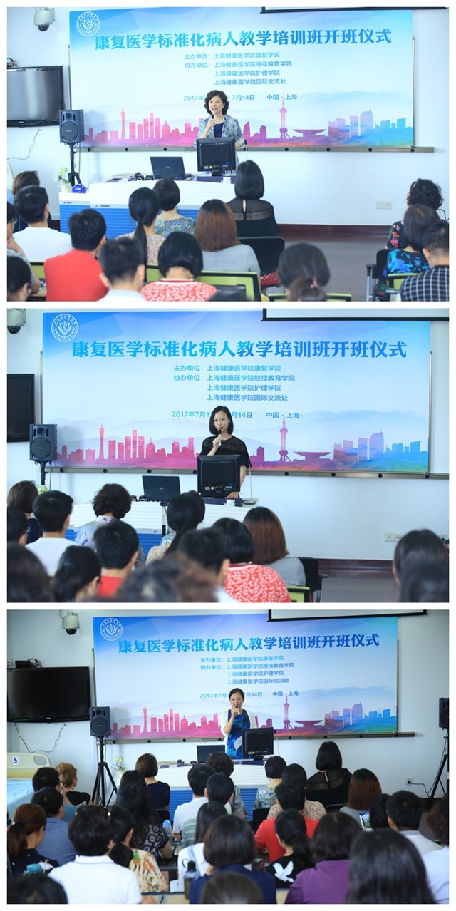 开班仪式上,我校唐红梅副校长讲述了上海健康医学院标准化病人(SP)应用探索历程,并表达没有标准就没有质量,高校要基于甚至高于标准培养康复人才的理念。随后,上海市教委方吕科长表达了市教委对康复人才培养的重视,充分肯定了本次培训班的举办。继续教育学院徐小萍院长和康复学院王红副院长也出席了开班仪式。