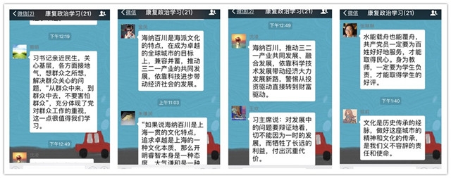 国庆长假一上班,康复学院党总支组织全体党员、九三学社和普通教师学习“习近平在上海”系列报道,第一步将三篇报道发到“康复政治学习群”,第二步交流体会。
