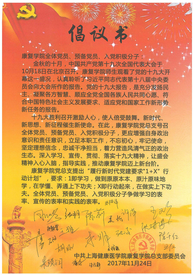 在组织学习前,康复学院领导班子高度重视,专题讨论如何落实学校下达的学习要求,制订了“履行新时代党建要求的‘1+X’行动计划”,1即学习,做到原原本本、原汁原味地学,在学懂、弄通上下功夫;X即行动起来,在做实上下功夫。学院领导带头学习,每人都分工落实党的十九大报告、中国共产党章程、十九大纪委工作报告等的学习、交流和考核,组织专题座谈会、课程思政交流会,推进学习效果,制订工作内容、学习形式、时间和主持人的实施方案。