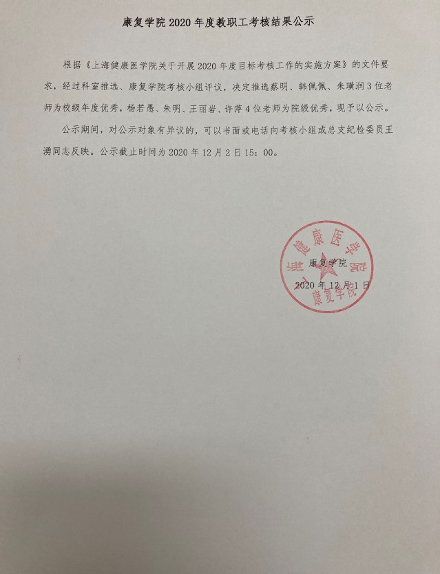 康复学院2020年度教职工考核结果公示
