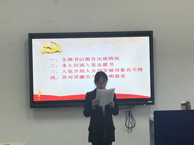 大会首先由胡冰老师发表讲话,胡老师首先指出了大家在党支部规模不断壮大的同时应更加注重保持党员的先进性,时刻严格要求自己;同时,胡冰老师希望本次的发展对象能够端正入党动机,做好接受党组织考验的准备。紧接着,发展对象上台宣读自己的入党志愿书,讲述了自己的入党动机、入党历程和对党的理解和认识,同时结合自己的实际情况表达了自己加入中国共产党的决心和强烈愿望。随后,作为入党介绍人的党员发表了意见。在座的其他党员同志也对发展对象发表了自己的意见和建议。在最终的投票表决阶段,各发展对象都顺利获得了现场正式党员半数以上的投票。随后,新一批预备党员表明了自己的决心,坚决服从组织,继续努力,全心全意为人民服务。