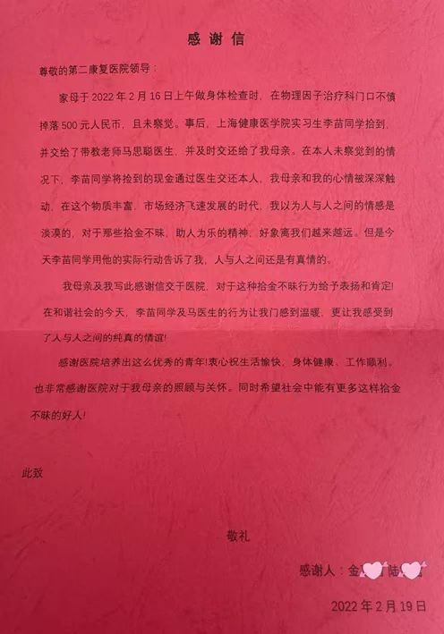 为表达对李苗的谢意,金阿姨特意事后让女儿写了一封感情真挚的感谢信。面对金阿姨的热情致谢,李苗表示这只是举手之劳,而拾金不昧也是她应该做的。