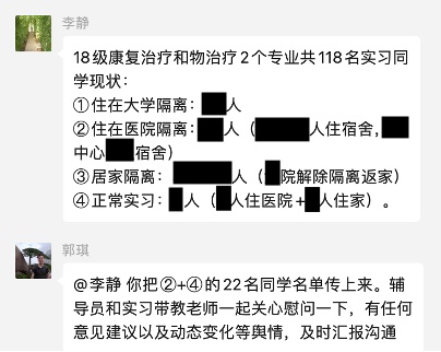 与此同时,部分实习单位仍在正常有序进行教学工作,仍有8名同学坚持在医院岗位继续实习,积极参加医院的疫情防控工作,展现出康复医务工作者应有的素质。